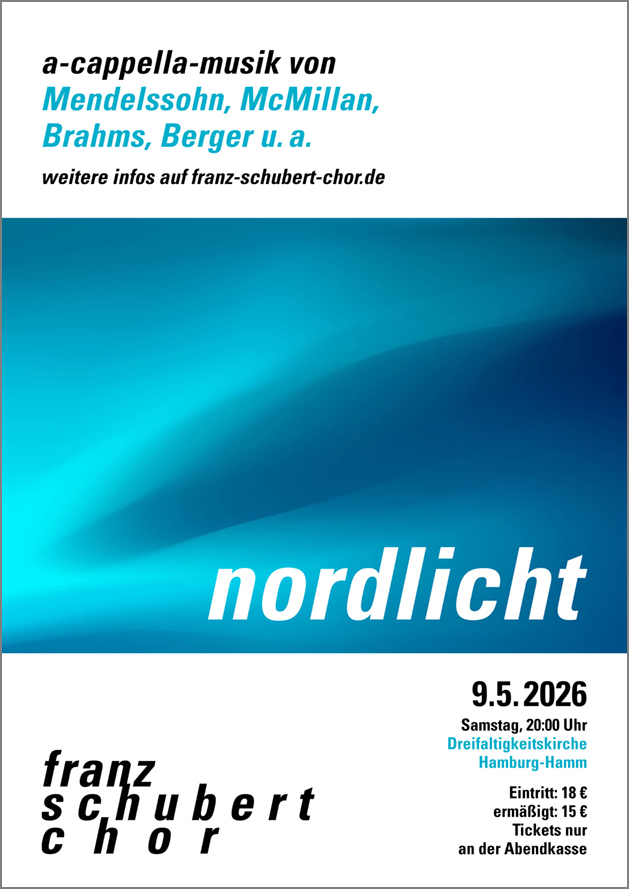 Mit dem A-cappella-Konzert „Nordlicht“ lädt der Franz-Schubert-Chor Hamburg zu einer musikalischen Reise in den hohen Norden Europas ein. Unter der Leitung von Christiane Hrasky widmet sich der Chor in diesem Programm den besonderen Klangfarben, Stimmungen und kulturellen Einflüssen, die das Chorwesen Skandinaviens, des Baltikums und Norddeutschlands prägen. Im Mittelpunkt stehen Komponistinnen und Komponisten aus Nordeuropa, deren Werke die Vielfalt und Tiefe dieser musikalischen Landschaft widerspiegeln – von der romantischen Klangsprache eines Felix Mendelssohn Bartholdy und Johannes Brahms bis zu den zeitgenössischen Ausdrucksformen von James MacMillan oder Jean Berger. Ein besonderes Highlight bildet „Advanced Democracy“ von Benjamin Britten, dessen eindringliche Klangsprache ein modernes Bekenntnis zu Freiheit, Gemeinschaft und gesellschaftlicher Verantwortung formuliert – Themen, die heute aktueller sind denn je.